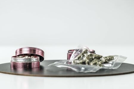 Close-up of medical marijuana buds in vacuum seal bags and grinder. Cannabis is a concept of herbal or alternative medicine