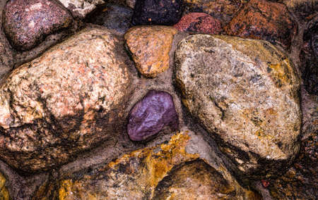 Background of a stone wall closeup. Texture of large and small multi-colored stones in concrete. Old wall.