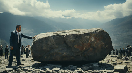 Businessman pushing large stone.