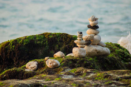Stones pyramid on pebble beach symbolizing stability, zen, harmony, balance. Shallow depth of field