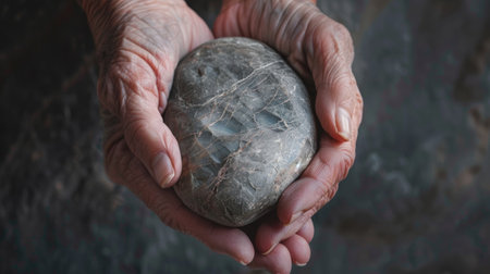A person is holding a rock in their hands. The rock is grey and has a rough texture