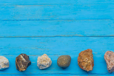 In the horizontal photo on the blue background are stones that were brought from the street. The stones have different shapes as well as color.