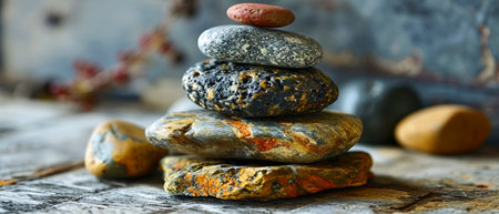 A stack of multi-colored stones balanced carefully, suggesting themes of stability, peace, and zen-like tranquility.