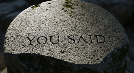A detailed close-up shot of a rough, weathered stone surface. The text YOU SAID: is deeply carved into the stone, with visible texture and subtle hints of moss growing in the crevices. The lighting casts shadows that highlight the three-dimensional of the inscription. The conveys a sense of permanence, history, and the weight of spoken words.