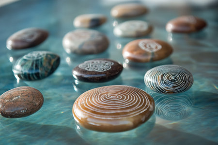 Tranquil digital composition evoking deep grounding and serenity through meticulous texture rendering of smooth surfaces and subtle moisture effects under soft diffused light. Ideal for mindfulness apps, wellness branding, spa promotions, yoga studio visuals, nature therapy resources, and eco-conscious design projects targeting health-focused audiences. Versatile ele... AI-generated illustration.