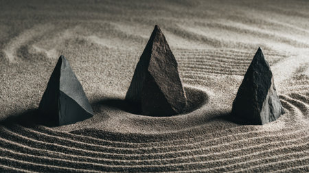 A serene composition featuring three sharp stone peaks emerging gracefully from smooth sand, embodying balance and harmony in a tranquil Zen garden setting.