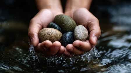 A hand holding a handful of rocks in a body of water. The rocks are of different sizes and colors, and the water is flowing around them. Concept of calmness and serenity