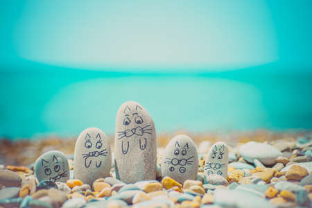Pebbles with drawn faces in the sand. Father, mother, daughter and son. Family of cats vocation concept.