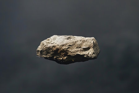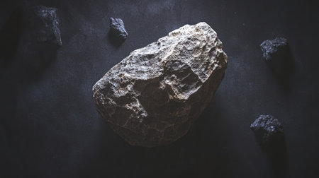 Depicting a small rock floating in black background, minimalism, yk aesthetic, high angle shot, hyper realistic photography