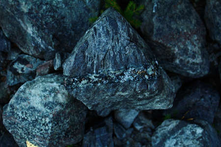 Raw ore on ground close-up. Multicolor rough stone in sunlight. Textured vivid geological background with pile of rude stones. Natural texture with copy space. Amazing mineral. Piece of rock.