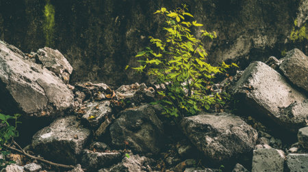 Plants grow through cracks in eroded stone, showing how nature takes back areas once dominated by civilization and human structures.