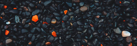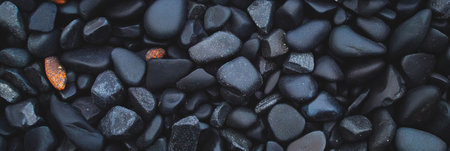 Close-up of wet, polished pebbles on a beach in earthy brown and black tones. Natural landscape texture for relaxation, meditation, and nature appreciation