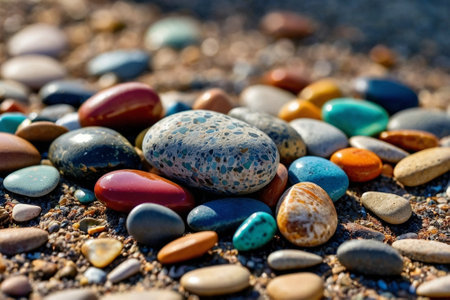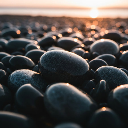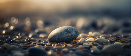This enchanting close-up image captures smooth pebbles on a shoreline, bathed in the soft light of sunrise. The stones create a natural texture, evoking peace.