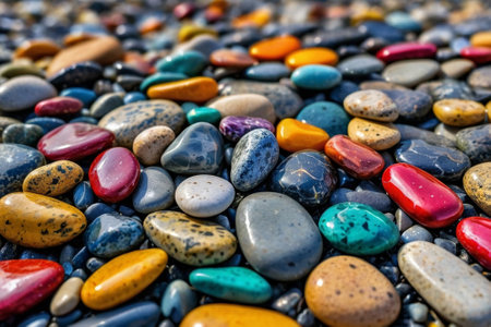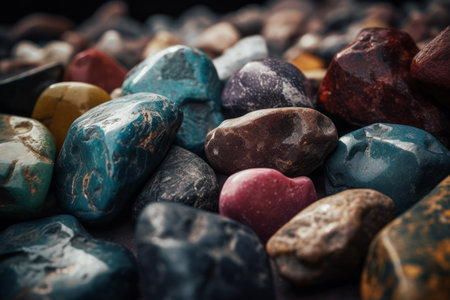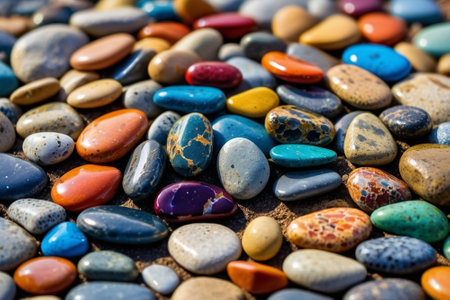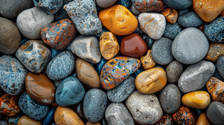 Smooth stones of various colors and textures, close-up view. Natural patterns and textures concept