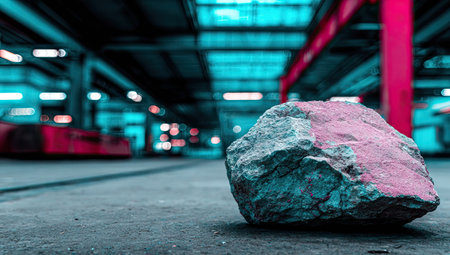 A close-up view presents a rock partially covered with pink paint. The object rests on a concrete surface within a large industrial interior. The composition is set against the backdrop of blurred building infrastructure and machinery. The image could be used for various commercial or editorial applications.