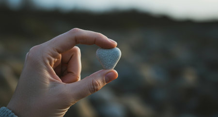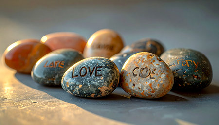 A collection of smooth, polished stones rests on a surface, bathed in the warm, golden glow of sunlight. In the foreground, the word LOVE is clearly engraved on one stone, serving as a gentle reminder of positive affirmations and mindfulness. The scene evokes a sense of peace, spirituality, and emotional well-being.