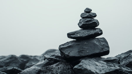 Black stones stacked on wet rocks against a misty background near the sea during early morning hours