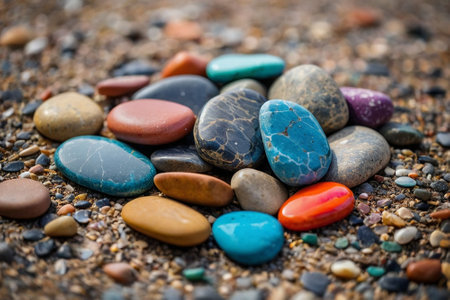 A close-up view of various colored rocks, showcasing their unique textures and hues in a natural setting.