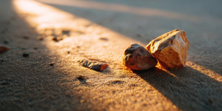 Two small stones on sandy surface with warm sunlight casting long shadows creating peaceful and natural atmosphere