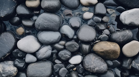 A detailed top-view close-up of underwater pebbles in different shapes and colors, forming a unique natural texture