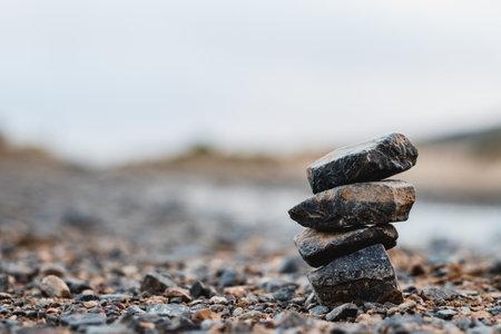 Stones pyramid on pebble beach symbolizing stability, zen, harmony, balance. Shallow depth of field