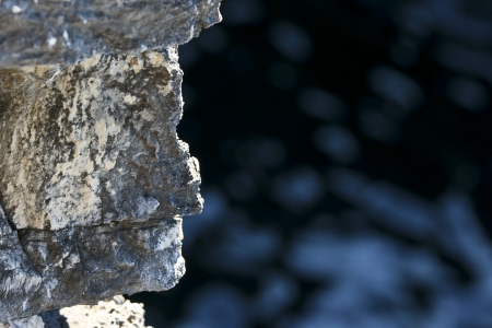 Close-up of a worn stone-carved head on a textured rock surface, highlighting ancient sculpting craftsmanship and historical artifacts.