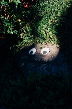 A rock with big eyes is partially hidden by lush green plants in a bright outdoor garden during the day.