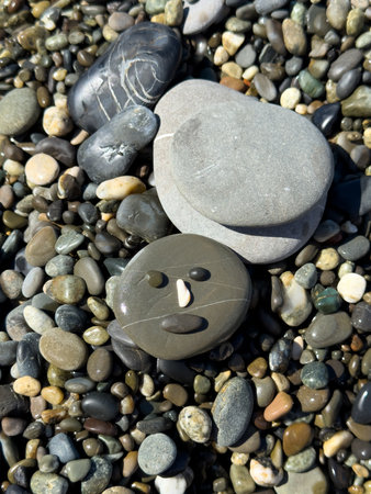 A rock with a face drawn on it is sitting on a pile of rocks. The face is made up of smaller rocks