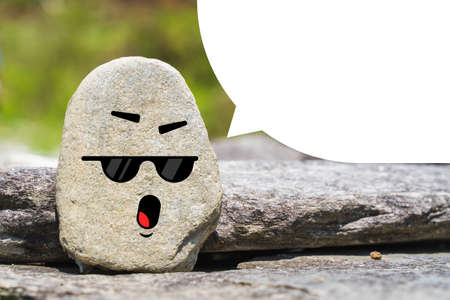 Natural stone with drawn funny face and speech bubble with copy space. Empty template for advertisement, sale banner, motivation poster etc.