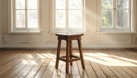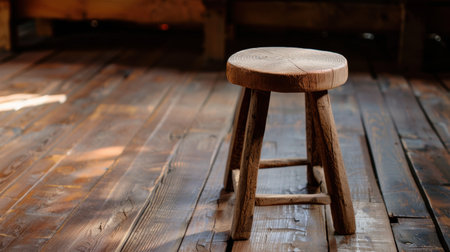 A simple yet elegant wooden stool sits on a polished hardwood floor, bathed in natural light. The scene evokes a warm and rustic atmosphere, perfect for minimalistic interior design.