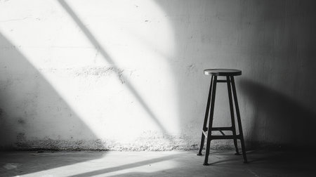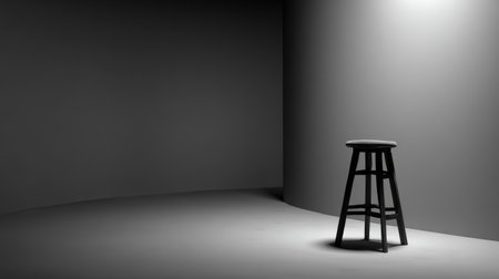 A striking minimalist composition featuring a black stool in an empty gray room bathed in soft light, evoking a serene and artistic atmosphere ideal for various creative projects.