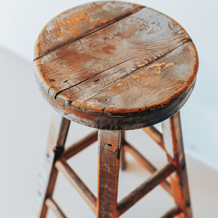 an old, rickety stool with distressed surfaces, captured in the style of a lensbaby effect. this photo showcases the unique charm of the stool, featuring a combination of light indigo and amber tones, as well as hints of dark white and light orange. whether you're looking to paint your own stool or purchase a new one, this image captures the essence of danish design. shot