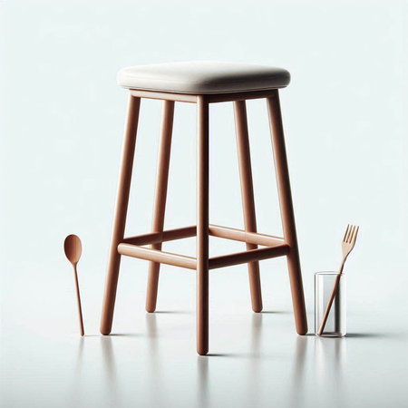 Wooden bar stool with fork and spoon on a white background.