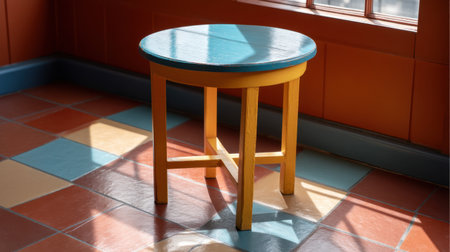 A colorful wooden stool rests in a sunlit room, surrounded by vibrant floor tiles, casting playful shadows. Perfect for adding warmth and charm to home decor.