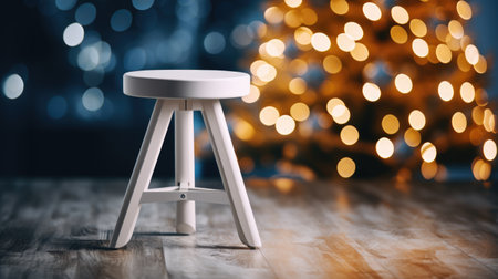 Beautiful festively decorated room with Christmas tree and bright lights, out of focus, shot for photo backdrop. stool for advertising products against the background of a Christmas tree