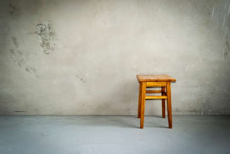 Wooden stool in empty room. Chair on cement floor. Grunge interior background.
