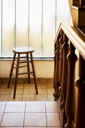 Wooden stool in a room with a window and sunlight in the morning