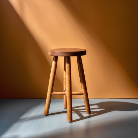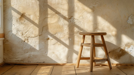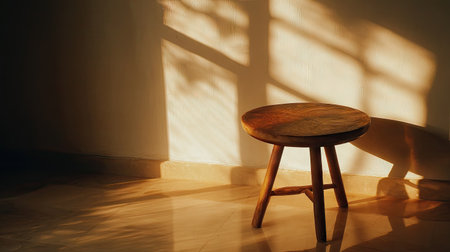 A simple wooden stool positioned in a room, illuminated by warm sunlight casting soft shadows on the wall, creating a serene and inviting atmosphere.