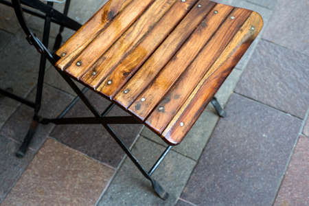 Closeup of wooden chair at the closed restaurant terrace in the street