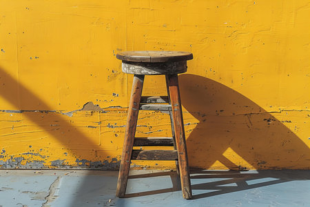 Wooden stool in front of a yellow wall with a shadow.