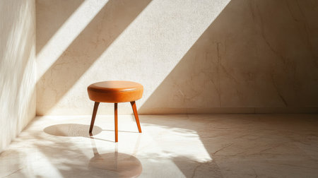A serene and stylish interior scene showcasing a wooden stool illuminated by warm sunlight, casting soft shadows on a smooth marble floor, embodying minimalist elegance.