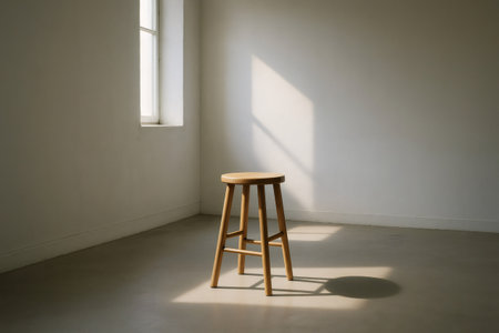 Wooden stool basking in warm sunlight streaming through the window, creating a serene atmosphere in a minimalist interior space