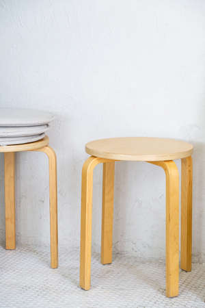 Wooden stool in the minimal style near the white wall of the small coffee cafe.