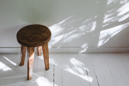 Wooden stool near the white wall, rustic interior details. Natural morning light.