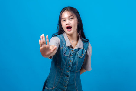 Young Asian woman raising hand with open palm in front of her as a stop gesture, with surprised expression. Isolated on blue background. Concept of warning, refusal, or alert.