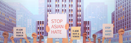 stop asian hate human hands holding banners against racism support people during pandemic