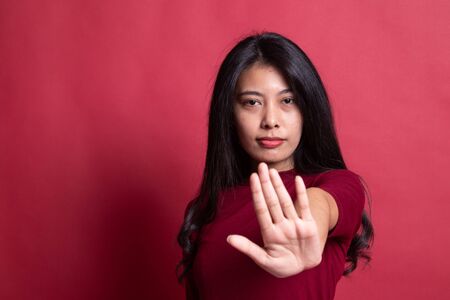 Portrait of an asian woman showing stop gesture on red background.