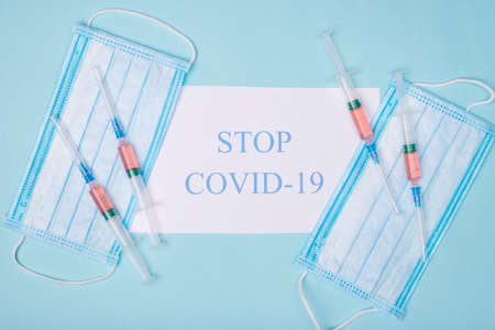 Stop COVID-19 concept. Top above overhead view photo of shots placed on top of masks isolated on blue background