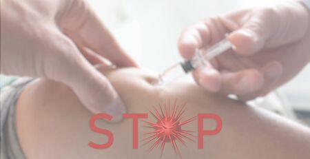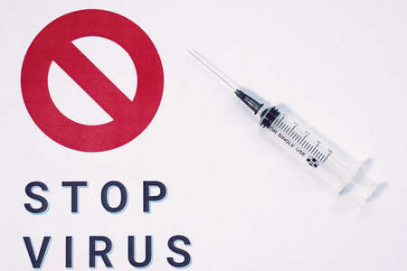 syringe for injection on a white background with the words STOP VIRUS and the symbol