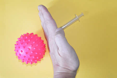 Syringe with vaccine covered with a red cross on a yellow background.